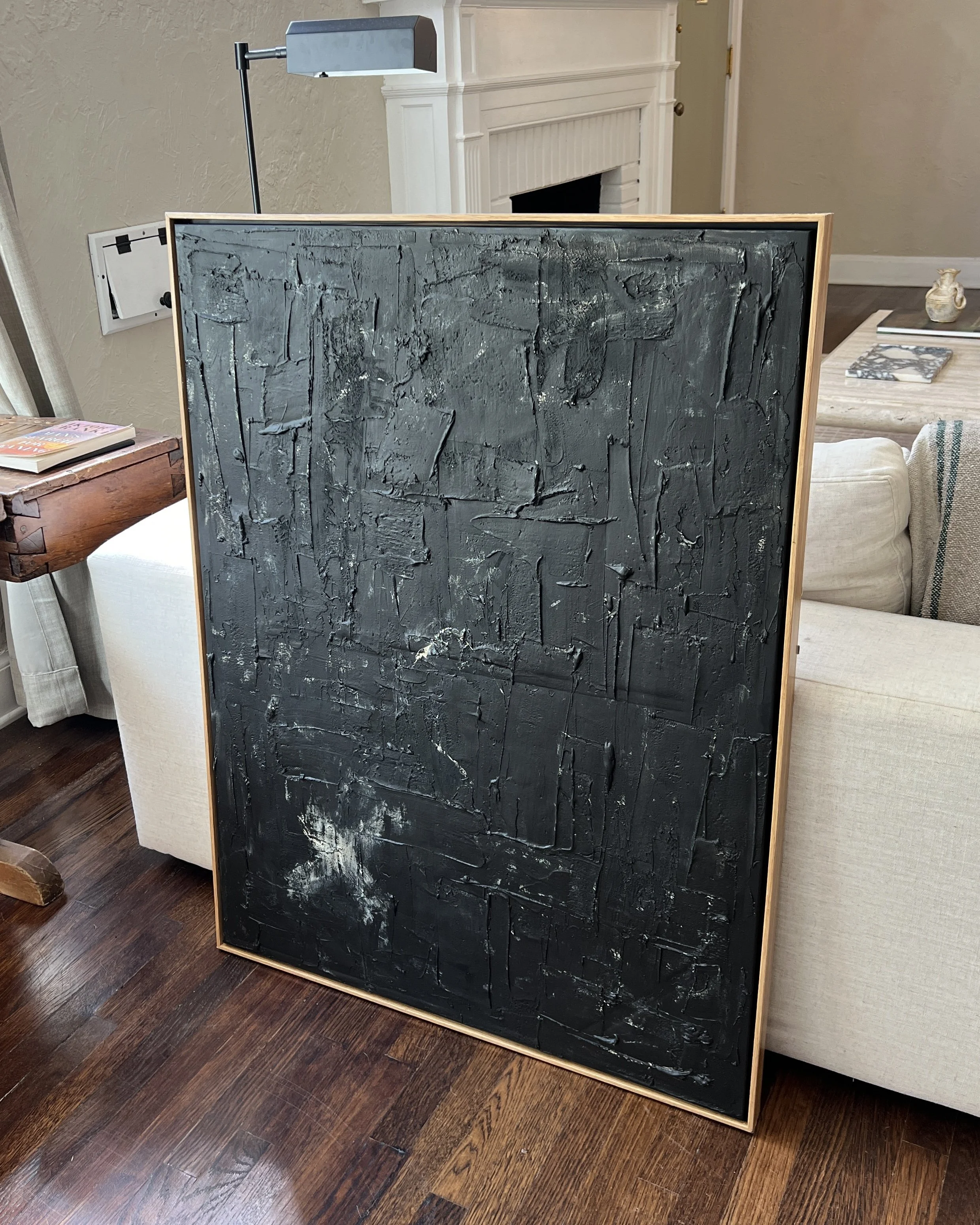 You’re pretty much done at this point! Once the paint dries you can either call it quits or give it a good inspection to determine if there’s any extra elements you might want to add. If you have a frame around your canvas, now is the time to take the tape off and see how it looks as a whole! I usually like to go over any spots that I may have missed with more black paint. You can add any extra colors, add more paste, or whatever new medium you like. But at this point, it’s pretty much complete! Now all you have to do now is find the perfect spot to hang your new art piece!
