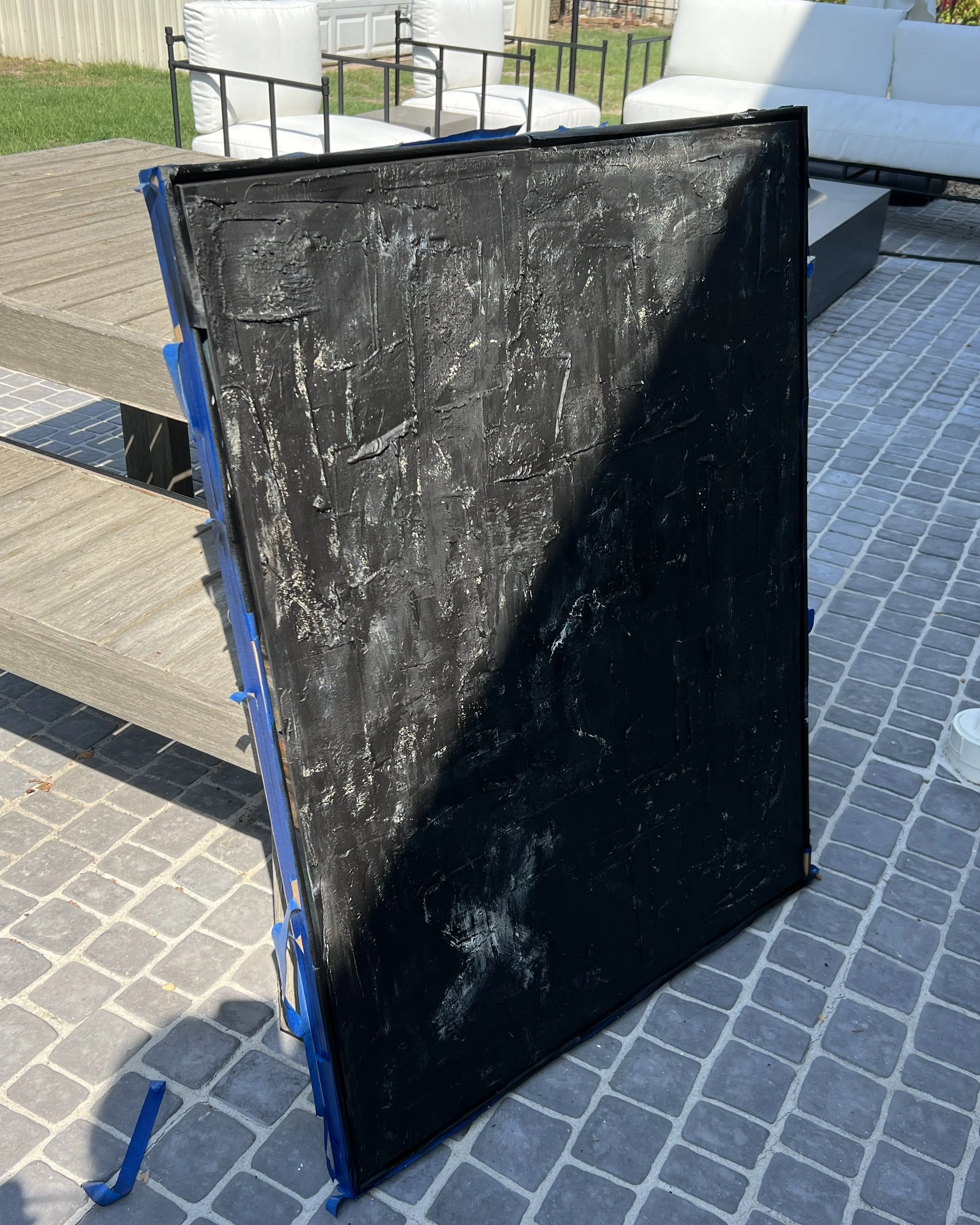 Here is how my canvas looked as it dried in the sun after applying a whole can of black matte spray paint.