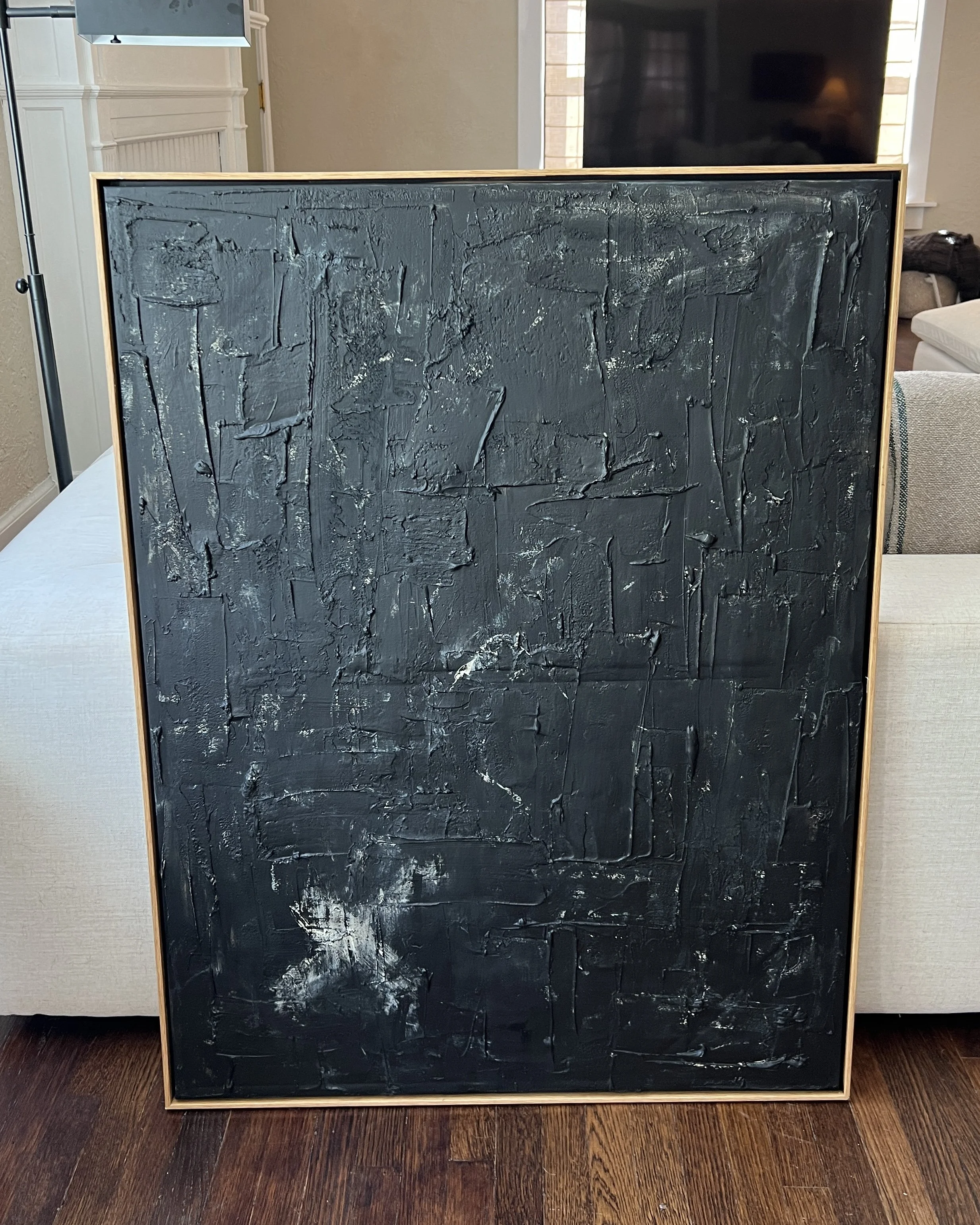 Here is a $9 large framed canvas that I picked up at my local thrift store! From afar, it looks as though it could be a textured piece, but it is just a mass-produced print.